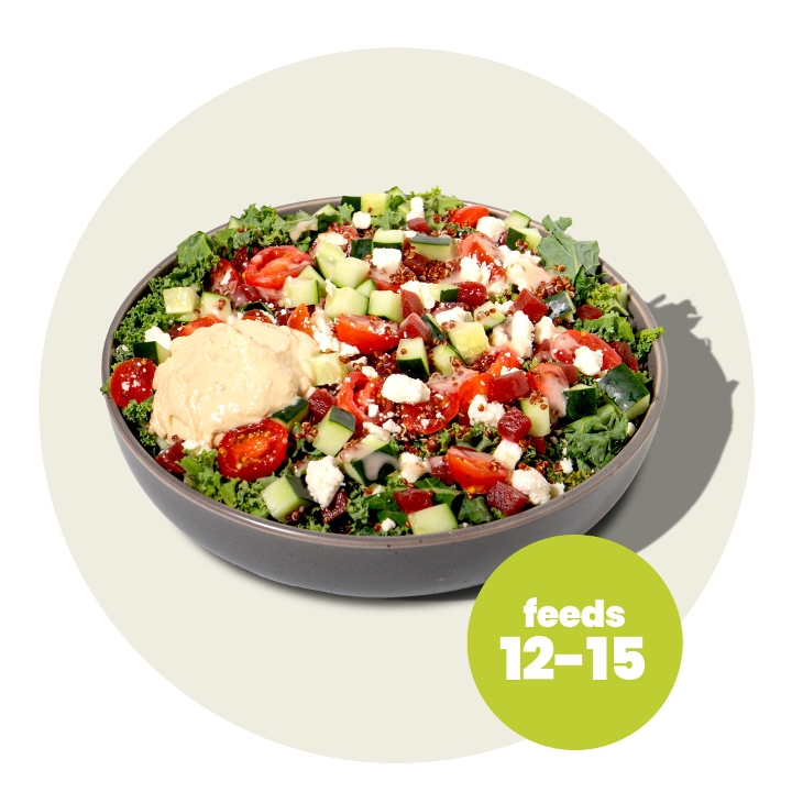 Freshly made salad with Feta cheese, kale, quinoa, hummus, honey ginger beets, grape tomatoes, cucumber, and red wine vinaigrette. Feeds 12-15 people.
