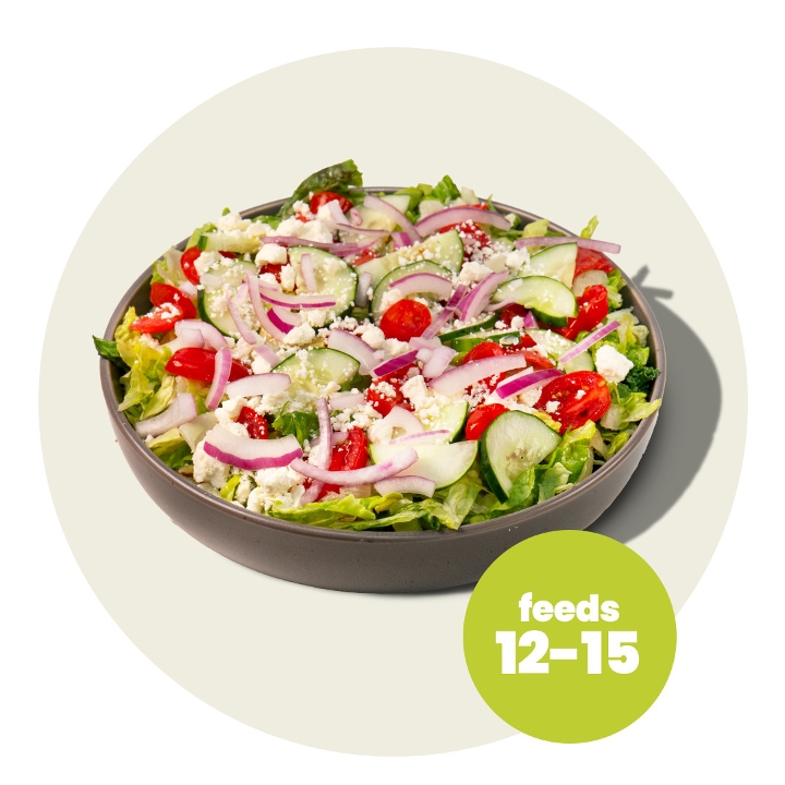 Freshly made salad with Feta cheese, crisp romaine lettuce, grape tomatoes, cucumbers, red onions, and red wine vinaigrette. Feeds 12-15 people.